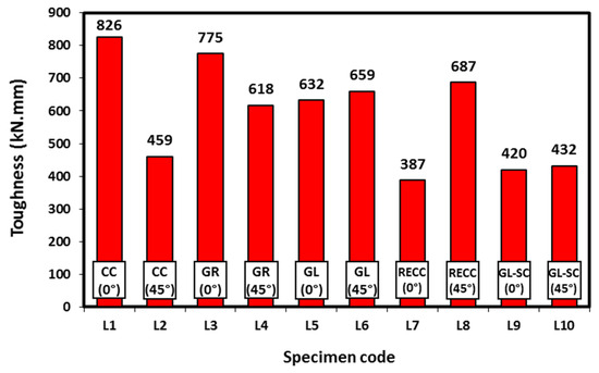 The toughness of the tested specimens was determined as the area under the load-deflection curves. The toughness of each slab–beam joint specimen is presented in Table 5 and Figure 10. At 0° joint angle, using Eco-Con in slab–beam joints decreased their measured toughness; however, at 45° joint angle, their toughness increased when using Eco-Con compared with that of the corresponding CC. This was due to the larger contact area at the old/new concrete interface when using a 45° joint angle, which allowed the Eco-Con to better contribute to the joint load-deflection performance, and hence resulted in better toughness. At a 0° joint angle, specimens L3 (GR), L5 (GL), and L7 (RECC) showed toughnesses that were 6%, 23%, and 53% lower than that of specimen L1 (CC), respectively. At a 45° joint angle, specimens L4 (GR), L6 (GL), and L8 (RECC) showed toughnesses that were 34%, 43%, and 50% higher than that of specimen L2 (CC), respectively.