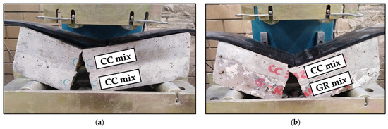 The performance of concrete joints in beams under four-point bending was measured using 100 × 100 × 350 mm beams produced with two halves of concrete (bottom and top). The bottom half was cast from an Eco-Con mix and the top half was cast from the CC mix, as shown in Figure 4. The failure mode of the tested concrete joints in beams using different Eco-Con mixes is shown in Figure 11. As shown, there was no evidence of failure or separation at the concrete joint interface in all tested specimens; however, they showed typical bending failure, with cracks initiated in the tension zone (bottom half) and extended to the compression zone (top half). All concrete joint specimens were broken into two separate pieces (right and left), except for the concrete joint produced with RECC mix as the bottom half and CC mix as the top half. This was due to the fibers used in the RECC mix that kept the concrete intact at the main crack location, even after failure occurred.