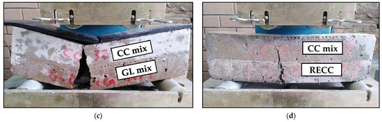 Failure mode of the tested concrete joints in beams subjected to bending: (a) CC/CC, (b) CC/GR, (c) CC/GL, and (d) CC/RECC.