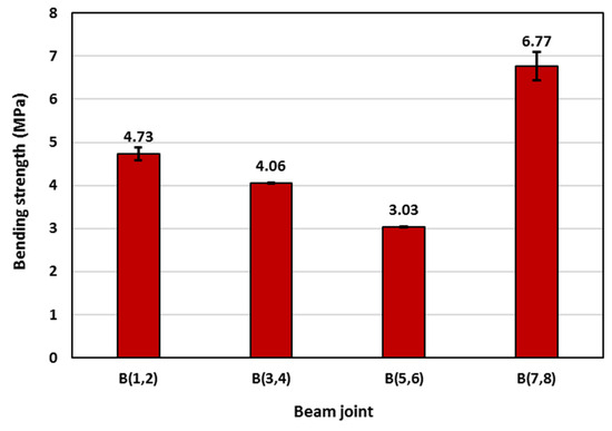 Table 6 and Figure 12 show the results of the tested concrete joints under bending. Similar to the bending strength behavior of Eco-Con mixes (see Figure 6c), the concrete joints produced with bottom halves of GR (specimens B3 and B4) and GL (specimens B5 and B6) mixes showed average bending strengths that were 14% and 36% lower than that of the concrete joints produced with the CC mix (specimens B1 and B2), respectively. Consequently, the concrete joints produced with RECC mix as the bottom half (specimens B7 and B7) showed an average bending strength that was 43% higher than that of concrete joints produced with the CC mix. This was due to the factors affecting the concrete bending strength, which is a function of its compressive strength (compression zone—top half) and tensile strength (tension zone—bottom half). As all concrete joints in beams were produced with the CC mix in the top half of the beam, the joint behavior depended mainly on the tensile/bending strength of the bottom half. The use of RECC mix in the concrete beam joint showed a joint average bending strength that was 1.67 and 2.24 times higher than those of the joints produced with GR and GL mixes, respectively. This indicated the superiority of RECC in repairing concrete beams subjected to bending load.