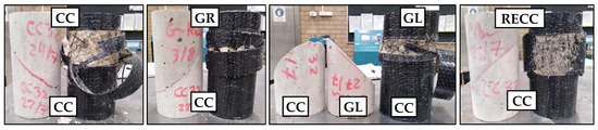 Figure 6d displays the measured direct shear strengths of all mixes determined using the double-L specimens. The geopolymer Eco-Con GR and GL mixes showed 14% and 21% lower shear strength than the CC mix, respectively. This was due to the rubber or LECA aggregates’ weakness in resisting direct shear forces compared with natural concrete sand. The RECC Eco-Con mix exhibited a direct shear strength that was 1.3 times that of the CC mix. This was attributed to the effectiveness of the PP fibers in increasing the shear resistance of concrete. For the same reason, the RECC mix showed a direct shear strength that was 1.5 times and 1.6 times the direct shear strengths of the GR and GL mixes, respectively.