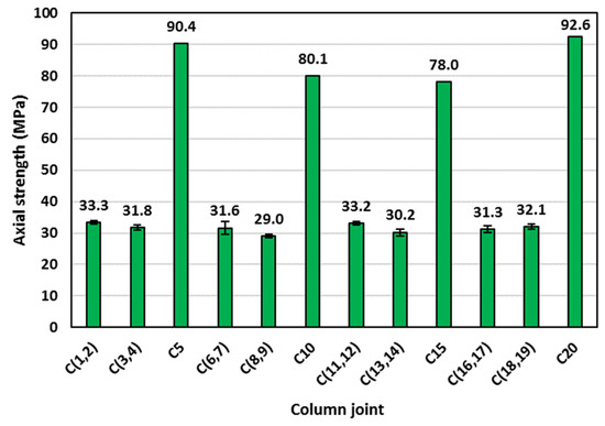 Average axial strength of the tested unconfined and FRP-confined column joints.