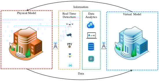 DTs are a technology that collects data in real time from physical assets and uses these data to create a virtual model of the physical asset to facilitate smart decision making. DTs use AI and data analytics to generate digital simulation models that can learn from and update based on multiple sources, as well as represent and predict the current and future conditions of their physical counterparts [48]. Deng et al. [20] proposed a DT evolved from BIM in a series of four developmental stages in which it was integrated with other technologies, such as simulations, sensors, and AI, operating at different levels. Furthermore, DTs utilize AI tools, such as machine learning (ML) and deep learning (DL), to organize and analyze data effectively in real time. This enables various functionalities, including condition monitoring, environmental learning, system failure prediction, real-time feedback, and bi-directional information integration throughout the entire lifecycle of the asset [21,22].