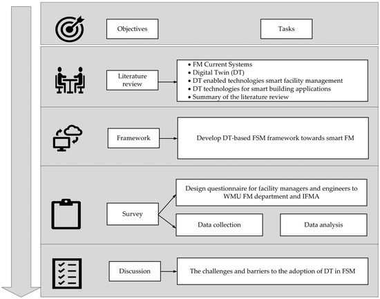 This paper aims to develop a conceptual framework for the evaluation of the facility manager’s level of acceptance of using DTs in FSM and to identify potential application areas for DTs. The research methodology is illustrated in Figure 2. The methodology started with a comprehensive review of the existing challenges in FM systems. This review explores the DT concept and its origins, highlighting its significance in FSM. Furthermore, it aids in investigating the potential advantages of DT in FM. The effectiveness of the DT-based FSM framework towards smart FM, such as BIM, the IoT, AI, and AR, is explored based on existing studies [92,93,94]. These technologies are recognized for their potential to enhance FSM systems and improve decision making [95,96]. From the insights of the review, a DT-based FSM framework for smart FM is proposed. This framework is designed to achieve smart FSM practices with improved information and communication. Afterward, a survey-based approach was implemented to collect data from FM professionals. This approach was crucial in creating a comprehensive understanding and capturing perceptions and opinions of DT adoption in the FM industry [97]. A questionnaire was subsequently developed based on the findings of the literature review. The questionnaire survey method was adopted for its ability to ensure participant anonymity and freedom, as well as to maintain the uniformity of responses [98]. Additionally, the adoption of a questionnaire survey in this study was motivated by its advantage in gathering empirical information from a broad range of respondents [99]. Furthermore, the survey aimed to assess participants’ comprehension of adopting DTs in FSE maintenance and fire evacuation practices and to identify potential issues that could be addressed early in the design phase [97].