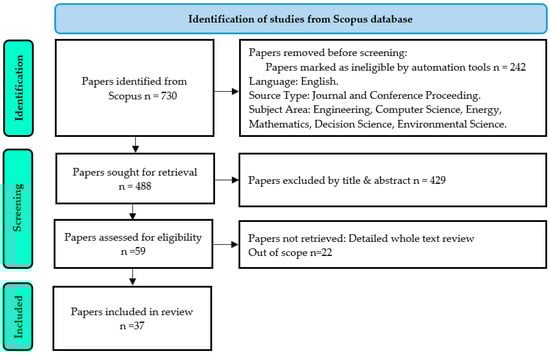 The literature search process involved identifying relevant keywords and performing a thorough query-based search to locate potential papers. To ensure the systematic review’s integrity and provide a detailed explanation of the literature search process, the authors employed the Preferred Reporting Items for Systematic Reviews and Meta-Analyses (PRISMA) 2020 flow diagram. This flow diagram provides a clear visual representation of the systematic review stages, making it easier for readers to track the decision-making process and how the initial literature search led to the final set of selected studies [100,101]. The literature search period was set from January 2012 to May 2023, as this was when DTs emerged as a significant technology and attracted substantial research interest. The initial search yielded 730 papers from Scopus, which were then filtered using automation to limit the language to English, the source type to journals and conference proceedings, and the subject area to engineering, computer science, energy, decision science, and environmental science. The entire literature retrieval process is summarized in Figure 3.