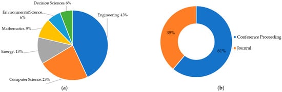 Studies on the use of DT in fire safety management and evacuation have been gaining momentum, with a significant increase in the number of research studies conducted recently. Figure 4 shows a clear trend in the publication distribution, with a remarkable increase in publications on DTs in FSM and fire evacuation in the past three years, highlighting growing interest in and the immense potential of intelligent FSM. Figure 5a indicates that most publications on DTs in FSM and fire evacuation belong to the fields of engineering and computer science, emphasizing the role of machines and computer-aided tools in advancing intelligent engineering solutions. Meanwhile, based on the type of document source, Figure 5b categorizes academic publications on DTs in FSM and fire evacuation from January 2012 to May 2023, revealing that 39% of the publications from this study are journal articles, while 61% are from conference proceedings.