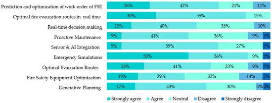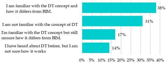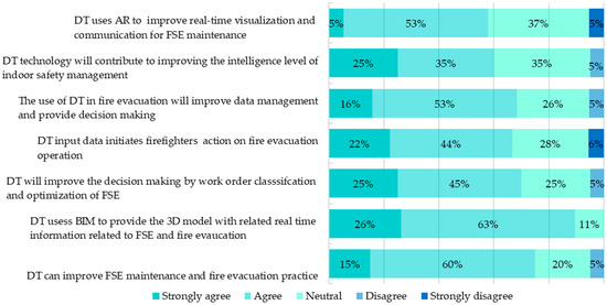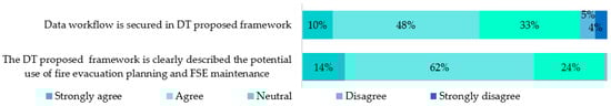 The survey started by introducing the aim of the study and the purpose of the survey. Before each question, a description was provided to ensure that the participants understood each question, reducing the sampling bias. The questionnaire began with demographic questions, such as their age, education level, work experience, and position. The questionnaires also included questions regarding current FM practices, issues, reasoning, and suggested solutions to improve FM practices with DTs. The participants were also asked about their experience with DTs, BIM, the IoT, AI, and AR [43,126]. The survey also asked about the impact of missing information on their decision making and solicited suggestions for enhancing the DT framework [43,127,128,129]. The survey included questions about participants’ familiarity and understanding of DT technologies in FM [126,129,130,131], the frequency of data collection for FSE maintenance [43,126], the expected benefits from DT technologies in FM [126,127,128,129], and the evaluation of DT technologies in FSE and fire evacuations [126,129,132].