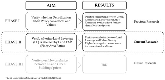 In developed regions, urban areas stand as significant contributors to climate change and greenhouse gas (GHG) emissions, consuming approximately 60% to 80% of global energy consumption, accounting for an equal share of global carbon dioxide emissions [7]. Meanwhile, buildings play a pivotal role in energy consumption, reaching a higher percentage (38.1%) of total energy consumption within the European Union, surpassing other sectors such as transportation (33.3%) and industry (25.9%) [8]. In particular, the residential sector, which is the larger stock in RE, holds the primary responsibility for energy consumption within buildings [9]. Considering this, one of the most interesting features to be investigated in the building sector is the energy efficiency performance of an asset and its change in value. To explore the relationship between the value of energy-efficient buildings and the value of the land, we are currently engaged in a larger-scale project that comprises three distinct phases (Figure 2). In Phase I, which has already been concluded, we verified correlations between land prices and densification policies, suggesting that density is a value-added feature that affects land prices, with higher values in denser areas [10,11]. Following Phase I’s findings, which highlighted that density changes the percentage composition of economic factors such as the incidence of costs and land value [10], we are currently developing Phase II to investigate possible correlations between density and Land Leverage. The insights from Phase II will serve as the groundwork for our future research (Phase III), aiming to investigate the potential impact of urban densification strategies on leveraging land as a key factor in enhancing the value of energy-efficient real estate assets.