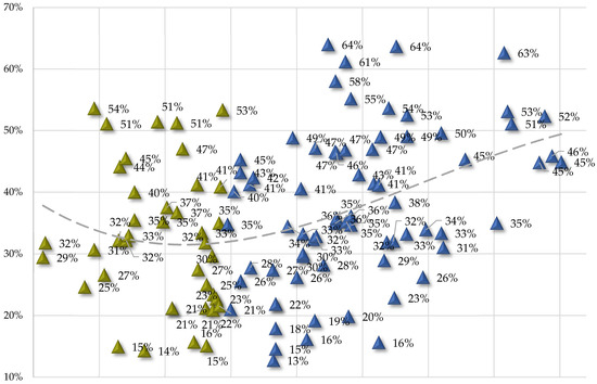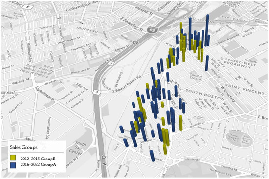 The average Land Leverage (LLi) within the sample stands at 35.5%, indicating that the building leverage (BLi) is 64.5%. As summarized in Table 1 and visualized in Figure 5, the difference observed in LLi between GroupB and GroupA amounts to 16.3%, which corresponds to the increase in the land ratio after increasing the allowable density, from an average of 32.50% in GroupB up to 37.80% in GroupA. Further, we can verify that the number of transactions increased by approximately 12.3% before and after zoning approval, with 10 average annual land sales before 2016, up to 11.08 after up-zoning tool approval, accounting for a partial year in 2022.