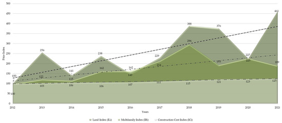 Finally, to verify any potential correlation between land price trends and the RE market and construction costs trend, we defined two different indexes. We collected 398 transactions of residential multifamily that occurred in the same timeframe period and in the same geographical area to build a Multifamily Transaction Price Index [10]. Ultimately, using the above-mentioned costs published by Marshall Valuation Services, we inferred a Construction Cost Index covering the analyzed timeframe.