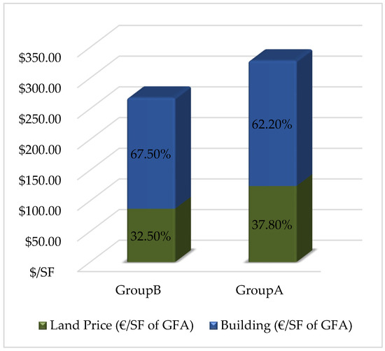 RE market value distribution between Land Leverage (Green) and building leverage (blue) on a USD/SF of GFA between the two groups. Source: authors.