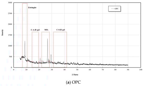 Figure 13 shows the XRD analysis results of a sample collected at 28 days of CLSM using stone sludge and ultra-rapid-hardening cement. The peak of SiO2 became more evident in the mix using stone sludge. The CLSM with ordinary Portland cement showed very low peaks except for ettringite. This is thought to be due to the relatively high W/B, which inhibited the smooth hydration reaction. The CLSM with ultra-rapid-hardening cement confirmed ettringite, C–S–H, and C–A–H gel hydrate, as shown by SEM. In particular, the ettringite peak clearly appeared in the mix using ultra-rapid-hardening cement. This is determined to be due to the hydration reaction characteristics of ultra-rapid-hardening cement, as described in Section 3.3.1. Furthermore, Al2O3 in ultra-rapid-hardening cement and SiO2, which is the main component of stone sludge, cause pozzolanic reactions with CH in the cement matrix, and this accelerates the hydration reaction compared to ordinary cement [44,45]. As a result, mixing proportions with ultra-rapid-hardening cement may produce more C–S–H and C–A–H. The C–S–H and C–A–H are generated through pozzolanic reaction and they are attached to the surface of stone sludge, and the density within the CLSM matrix increases, thereby reducing harmful voids [46].