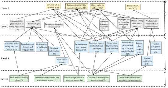 Following this, utilizing the results obtained from the preliminary computations, the hierarchical relationships were ascertained by employing Equation (8) to scrutinize the intersections, thus facilitating the establishment of a rigorously delineated hierarchical structure. L1 = [16 F28]; L2 = [16 F20, F22, F23, F24]; L3 = [16 F12, F13, F14, F15, F16, F17, F18, F19, F21]; L4 = [16 F4, F5]. Utilizing the results derived from the stratification process, a schematic representation delineating the hierarchical interrelationships of risk factors impacting safety during the rotational construction of continuous girders across existing lines was constructed. This schematic systematically depicts all direct associations based on the adjacency matrix A, resulting in a nuanced multi-level progressive structure, as exemplified in