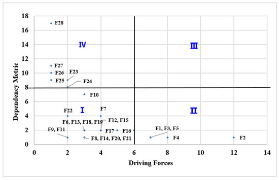 44]. The MICMAC method analyzes the interaction among different system factors, primarily concentrating on assessing the strength of each factor’s driving and dependency forces [