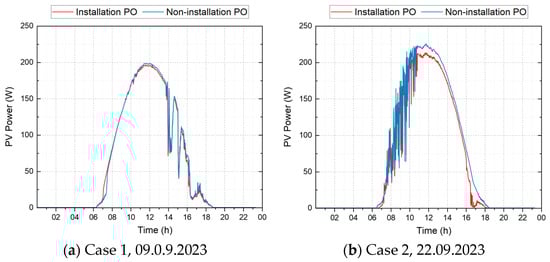 Six experimental cases were considered as follows. In Case 1, no power optimizer was installed, while in Case 2, a power optimizer was installed in module A. In Case 3, a shade ratio of 10% was applied to one of the two modules of each array, along with the conditions of Case 2, and in Cases 4, 5, and 6, the shade ratio was increased to 25%, 50%, and 75%, respectively.