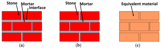 Unfortunately, this type of stress–strain curve requires large computing effort, mostly beyond a reasonable limit. In addition, the graph does not include the characteristics of the contact layer between stones and mortar. Because of this, simplified models are often used [14]. The full micro-model, including nonlinear characteristics of stones, mortar, and the interface shown in Figure 3a, may be replaced by suppressing the interface conditions, thus creating a continuous micro-model, which is already less demanding, as exhibited in Figure 3b. A further step is to consider a discrete macro-model of several stones and mortar joints as a nonlinear solid, as shown in Figure 3c. According to the literature, the latter model is rather efficient, provided the out-of-plane effects are limited.