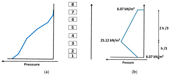 These results are not directly applicable to the case of river torrents. For waves in coastal areas, a distribution of the pressure is found that closely resembles a hydrostatic, i.e., triangular distribution, which was found in a previous experimental study by measuring at eight points along a vertical line indicating the storm barrier [15]. This is indicated in Figure 4a, which shows that the distribution is almost triangular. For the case of water-retaining walls along the Scheldt River in Antwerp, recommendations from German standards were considered [16].