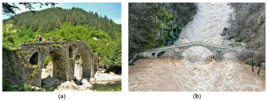 The Devil’s Bridge crosses the Arda River near the town of Dyadovtsi; it was built from 1515 to 1518, replacing a Roman bridge. According to [18], this bridge has remarkable architecture from the Ottoman period. A particular characteristic is the small width of 3.4 m for a 65.7 m long and height of 12.2 m above the water level. The bridge is exhibited in Figure 5a in normal conditions.