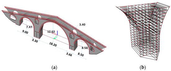 Model of Devil’s Bridge with plate elements: (a) model using plate elements (skew view); (b) pier composed of plate elements.