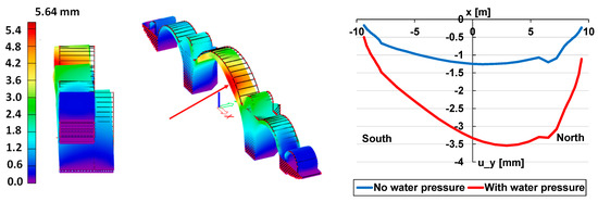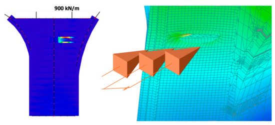 The effect of debris is very different from that of the torrent wave. Debris is a local load, and the simulation clearly shows this as a result. For example, in Figure 10, the strains in the material are shown on the left, and on the right, the deformation due to an impact of debris of 900 kN is illustrated. This last value corresponds to the water height of 5.67 m. The fact that the impact of debris mainly exerts a local effect should not be interpreted as meaning that this is a negligible load, quite the contrary. The local destruction of masonry favors the general collapse mechanism, as is the case for the wave torrent, and accelerates the loss of equilibrium, especially in the section of the pier where the destruction is caused.