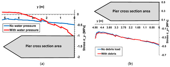 (a) Vertical stress at the pier base due to water pressure; (b) vertical stress at the pier base due to debris.