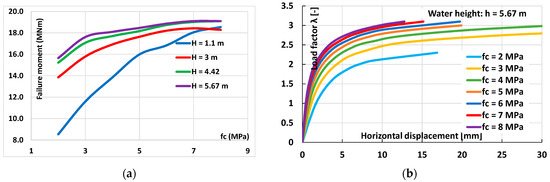 Unexpectedly, the amount of the failure load is independent of the brickwork’s compressive strength. Because of this, the previously mentioned mechanism is unable to function. The failure moment of the pier is shown in Figure 9a as a function of fc, the masonry’s strength, for various values of the water height. Because the lever arm varies with each water height, the value of the bending moment may be more significant than the failure load. It can be seen from the graph that, at a small water height, the failure value still increases with fc, but once a moderate height is considered, there is only a small increase. In that context, the graph of Figure 9b, which gives the horizontal displacements of the pier top for H = 5.67 m as a function of fc, is clearer. It becomes apparent that the displacements no longer increase appreciably as soon as fc = 4 MPa. Displacements do not indicate a clear failure state but are useful for creating a Southwell plot [20]. As is known, the slope of the line of such a graph is inversely proportional to the failure load. For the different values of fc, one finds almost perfect linear relationships with covariances ranging from 0.9964 to 0.9999. This method is therefore suitable for determining reliable values of the failure load.
