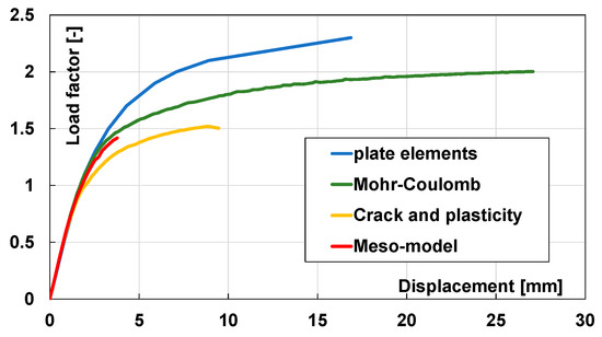 From these different simulations, it can be concluded that the use of solid elements leads to a reduction of 0.84 times the failure load and the use of crack and plasticity further gives a reduction of 0.59 times the initial value. This last number does not significantly differ from the result for the meso-model with brittle behavior, for which the failure load gives 0.55 times the value of the first model. The main point is that the Mohr–Coulomb approach fails. Going back to Equation (4), realistic values for tan φ are understood to be between 0.2 and 0.4, because this is the friction factor of bricks on mortar layers. Realistic values for the cohesion c vary from 0 to 0.04 MPa. The application of the Mohr–Coulomb equation for fc = 2 MPa and ft = 0.1 MPa gives tan φ = 2.12 and c = 0.224. Neither value is realistic. Because of this, the failure by shear cannot be accurately determined using the Mohr–Coulomb equation. The brittle fracture meso-model gives tan φ = 0.3 and c = 0.02. These values are certainly acceptable.