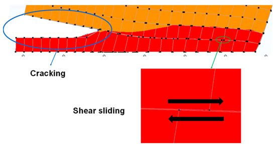 Since shear is the cause of the failure, it is evident that sophisticated models with specific features are required in this case. Should this not be the case, then even an approach with plates will already give a decent result. To clarify the mechanism, Figure 13 shows a detail of a vertical section in the pier, which clearly shows that a horizontal crack is formed due to tension. As a result, the area of the cross-section is reduced, and it collapses due to shear and not due to excessive compression.