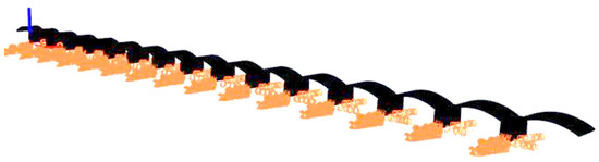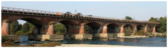 The Candia Viaduct crosses the Sesia River near the town of Candia Lomellina, to flow a little further into the Po. It comprises 16 spans of pressed masonry arches with an opening of 17 m. The ratio of the arrow of the arch to the gap between the arch births is only 0.153. This viaduct was investigated with monitoring because damage to the piers was found as a result of scour [21]. The width of the viaduct is 10.05 m, and the ratio of this width to the height of the top of the arches is therefore 10.05/5.58 = 1.80. This value is considerably higher than the ratio of 0.40 for Devil’s Bridge. The front view of the viaduct is exhibited in Figure 14.