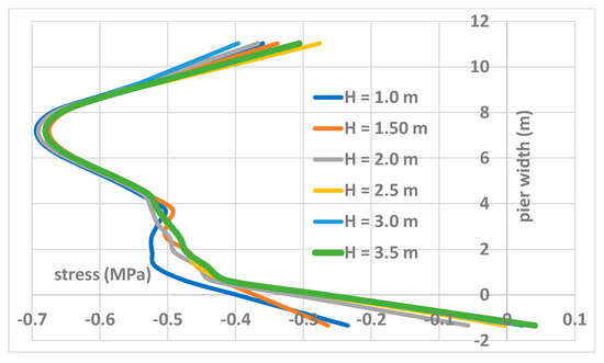 The failure load was determined in the same way as in the previous case. For the case of the torrent wave, a consistent result was found, as long as the strength fc was limited to the lowest value of 3.1 MPa. The Southwell plot for this material strength is also a quasi-linear graph that shows a failure load magnitude of 974 kN. For higher values of fc, the graph is much too unclear, and the application of the Southwell plot fails. The vertical stresses at the base of the pier do not reach their maximum value at the ends of the cross-section but rather at a distance of 0.25 times the width of 10.50 m from the pier. This is due to the fact that the piers are wider than the vaulted arches. The vertical stress is exhibited in Figure 16, for various values of the wave height.