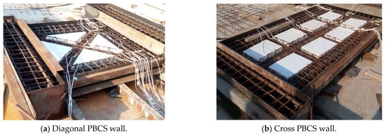 The reinforcement scheme for the two types of PBCS walls is shown in Figure 2. The concealed columns in PBCS walls contained 6C14 steel bars (with yielding strength fy = 410 MPa and ultimate strength fu = 610 MPa), which were connected with the base beam to transfer the tensile forces. The concealed RC bracings consisting of 4C8 steel bars were arranged in the panels in order to achieve a more even distribution of damage. There were two concealed beams (6C10 as longitudinal bars) set at the top and bottom of PBCS wall panels, respectively. The Φ6.5 steel bars (with yielding strength fy = 420 MPa and ultimate strength fu = 580 MPa) spaced at 150 mm were adopted in the horizontal and vertical web reinforcement. In addition, the compressive strength of concrete in this paper was 28.2 MPa.