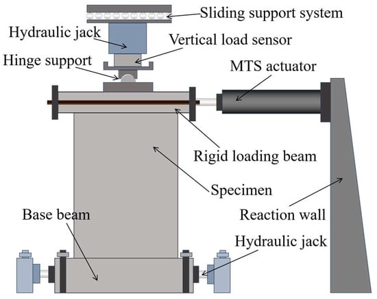 All specimens were fabricated at the scale of approximately 0.75 and were tested under vertical load and lateral cyclic load (Figure 3). The ALR applying to the loading beam herein was a constant of 0.1. The axial load was first applied to the rigid beam and remained stable throughout the test. Then, the displacement-controlled lateral load was uniformly increased to a drift ratio of Δy = 0.33% in five incremental levels (loaded once for every loading level). Afterward, the lateral load increased by 0.33% of the drift ratio (loaded twice for every loading level), and the test was finally terminated when the lateral resistances of the specimen decreased by 15% or wall failure occurred. During the experimental process, the lateral displacement at the top of the wall and the shear resistances at the base beam of the wall were recorded.