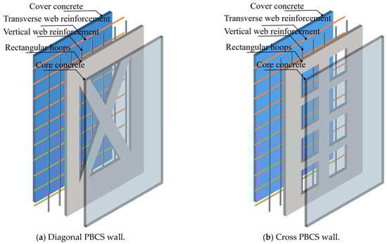 The hysteretic behaviors of PBCS walls with different SSRs and bracing types were experimentally investigated in the previous study performed by Li et al. [26]. The structural layouts of PBCS walls with diagonal braces and cross braces embedded are listed in Figure 1a,b, respectively. There were seven specimens, with SSRs varying from 1.0 to 2.0 (three diagonal PBCS walls, three cross PBCS walls and one monolithic cast in situ RC wall as the counterpart). It should be noted that the number of triangular EPS boards in diagonal PBCS walls remained constant at four, while that in cross PBCS walls ranged from four to eight as the SSR increased, as shown in Figure 1. Diagonal PBCS walls consisted of two diagonal braces, which intersected at the middle of the wall and expanded into the top and bottom beams, respectively. One vertical brace and several horizontal braces were embedded in the cross PBCS wall panels. The number of horizontal braces was determined by the principle of equivalent volumetric ratio of the diagonal braces in the corresponding PBCS walls with the same SSR.