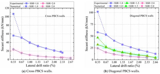 Previous research has shown that the hysteresis behaviors, including energy dissipation capacity and lateral deformation capacity, of PBCS walls can be properly predicted by the multi-layer shell elements. Stiffness degradation, as an important factor of the hysteretic performance of shear walls, is taken herein to validate the accuracy of numerical models. Secant stiffness can be obtained by Equation (1).
