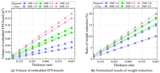 By increasing the thickness ratio of the EPS board, the structural weight of the PBCS wall can be efficiently reduced; the concrete use of the structure is also decreased. Figure 6 illustrates the impact of thickness ratio on weight reduction in PBCS walls. It is evident that the volume of the embedded EPS board increases significantly with the increase in SSR and thickness ratio, resulting in lower use of concrete. Furthermore, the volumetric ratio of the EPS board to the entire wall is calculated to obtain the normalized curves of weight reduction (Figure 6b). A near 20% reduction in concrete use is observed for the cross PBCS walls, which is 11.67% higher than the maximum value of the diagonal PBCS walls. Compared to conventional shear walls, PBCS walls have certain insulation functions with additional filling of the walls with EPS panels. Meanwhile, the amount of concrete used in PBCS walls can be remarkably reduced, which is beneficial for energy conservation and emission reduction. The integrity of PBCS walls outperforms that of sandwich PC walls by embedding EPS boards between the bracings.
