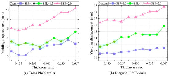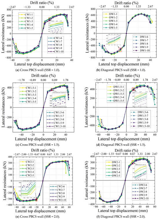 Moreover, by comparing the skeleton curves of PBCS walls with different SSRs, it is concluded that the lateral elastic stiffness of PBCS walls with low SSRs experienced a more significant variation than that of walls with a high SSR (Figure 7a,b). This is in part because shear walls with low SSRs are more prone to shear failure characterized by concrete crushing. Additionally, the increase in the thickness ratio of the EPS board further weakens the bearing capacity provided by concrete. In addition, it is suggested in Figure 7a,e that the thickness ratio of the cross PBCS wall with a low SSR (SSR = 1.0) has a more noticeable impact on its hysteresis response relative to the other cases. However, the hysteresis response of the diagonal PBCS wall is more sensitive to the escalation in thickness ratio at a high SSR (SSR = 2.0).