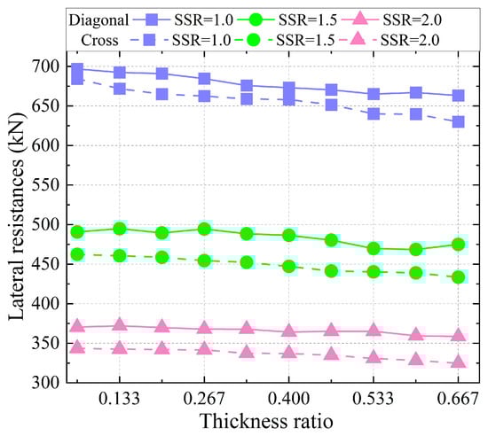 Figure 8 exhibits the lateral bearing capacity of PBCS walls with different SSRs, bracing types and thickness ratios of the EPS board. As shown in the figure, there is a gradual decrease in peak forces as the thickness ratio increases for both diagonal and cross layouts of PBCS walls. This is due to the reduction in concrete use. Nevertheless, a maximum decline of only 4.8% and 7.9% in lateral shear resistances is observed for the diagonal and cross PBCS walls, respectively, with a low SSR of 1.0. Additionally, it can be concluded from Figure 8 that the SSR outweighs the bracing type and thickness ratio in affecting the shear bearing capacity of PBCS walls.