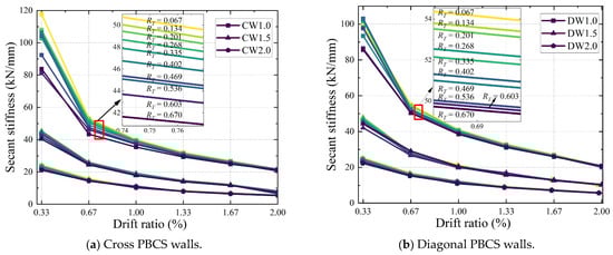 To facilitate comparison, the stiffness–drift ratio curves of each loading level were derived by dividing the lateral displacement by the corresponding height of the wall, as shown in Figure 9. For simplicity, the lines presented in Figure 9 vary from light colors to dark colors, which correspond to the thickness ratio of the EPS board from 0.067 to 0.667. It can be observed that before the drift ratio reaches 0.67%, the stiffness in all cases decreases rapidly. During this stage, the maximum stiffness degradation occurs at SSR = 1.0, with stiffness of the cross PBCS wall and diagonal PBCS wall decreasing by 54.9% and 49.5%, respectively (compared to initial stiffness). The deterioration in stiffness during this stage is mainly attributed to the large number of concrete cracks generated in the early stage of loading. Subsequently, the lateral stiffness of the wall gradually decreases, with stiffness of the cross PBCS wall and diagonal PBCS wall descending, respectively, by 31.1% and 34.6% (compared to initial stiffness), from a drift ratio of 0.67%–2.0%. Stiffness degradation during this stage is mainly due to the further cracking of concrete and the ability of steel bars to provide resistance even after entering the plastic stage.