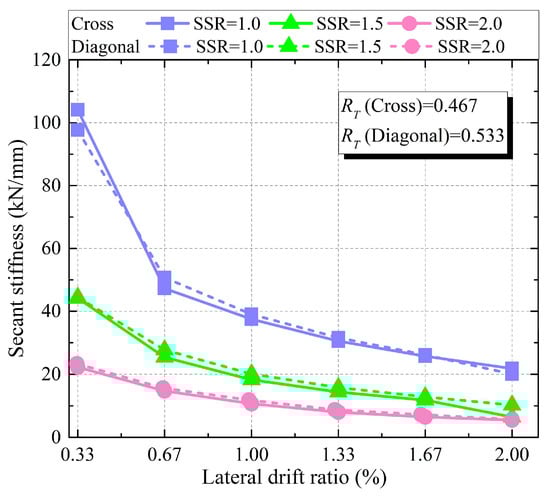 To comprehensively investigate the influences of embedded EPS boards on the stiffness degradation of PBCS walls, the stiffness degradation curves of cases with similar amounts of EPS embedded are shown in Figure 10. When the thickness ratios of cross and diagonal PBCS walls are 0.467 and 0.533, respectively, the EPS volumes of the two types of PBCS walls are similar (with the same SSR). This means that in order to embed the same volume of the EPS board, the diagonal PBCS wall requires a thicker EPS board than the cross PBCS wall. Figure 10 shows that when the filling volumes are the same, the stiffness degradation process of the two types of walls is basically the same. The diagonal PBCS wall exhibits slightly greater stiffness than the cross PBCS wall during the loading process. This can be attributed to the fact that the diagonal bracing layout has higher stiffness compared to the cross bracing layout.