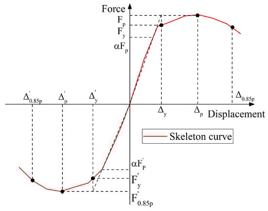 Ductility of a shear wall is a crucial factor, which reflects its deformation capacity. It is typically represented by the ratio of ultimate displacement (Δ0.85p) to yielding displacement (Δy) of the wall. The yielding displacement of the wall is determined using the method proposed by Park et al. [47], while the ultimate displacement is obtained when the peak strength of the wall decreases by 15%, as illustrated in Figure 11. In this approach, α is the load coefficient, which is taken as 0.75.