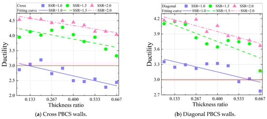 The ductility capacities of PBCS walls with different bracing types are presented in Figure 13. It can be seen that the ductility of the PBCS wall descends evidently with an increase in the thickness ratio. This can be explained by a previous study [41], which demonstrated that PBCS walls with high ALR are susceptible to low ductility capacities. Specifically, the increase in the thickness of the EPS board leads to a reduction in the net cross-sectional area of the wall. As a consequence, the ALR is improved in spite of the axial loads remaining constant. In addition, a horizontal line μ = 3.0 is presented in the figure to represent the code requirement that the ductility of the shear wall should not be lower than 3.0 [46]. It can be observed that the ductility of all diagonal PBCS walls can nearly meet the code requirements as the EPS board thickness ratio changes. In particular, the diagonal PBCS wall with SSR = 1.0 should be designed with a thickness ratio below 0.6 to satisfy the requirements of displacement ductility greater than 3.0. In addition, the ductility of the cross PBCS wall generally falls below the code requirements when the SSR is 1.0, indicating that the design schemes for cross PBCS walls with SSR = 1.0 or lower should be avoided.