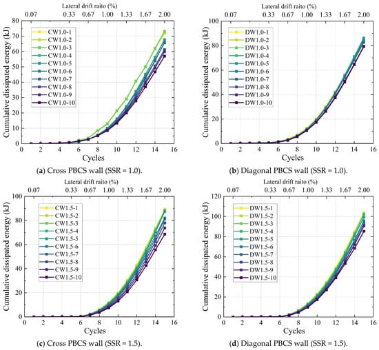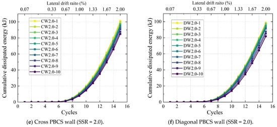 In addition, the energy dissipation of cross PBCS walls with SSRs of 1.0 and 1.5 is more sensitive to the variation in thickness ratio relative to diagonal PBCS walls (Figure 14a–d). The cross PBCS wall with SSR = 1.0 saw a fall of 20.7% (from 71.8 kJ to 57 kJ) in accumulated dissipated energy, while a decrease of only 7.8% (from 86.3 kJ to 79.5 kJ) was observed in the diagonal PBCS wall. PBCS walls with low SSRs are especially vulnerable to shear failure characterized by diagonal cracks, whereas the diagonal braces in PBCS walls can effectively slow down the development of these diagonal cracks. Therefore, diagonal PBCS walls with low SSRs behave better in terms of energy dissipation.