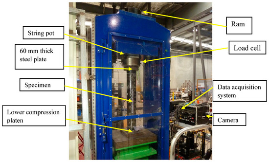 The label of each specimen consists of “CL”, denoting a CFRP-encased long column, followed by inner steel tube diameter and percentage of rubber replacement (0%, 15%, or 30%). For example, CL-I60-30 refers to the hybrid double-skin slender specimen with CFRP outer tube, inner steel tube of 60.3 mm diameter, and a rubber replacement ratio of 30. The heights of all three columns were 1000 mm. The coarse aggregates included 7–10 mm and 1–4 mm crushed rock; 10 mm aggregate was the maximum aggregate size. Rubber samples of 7–10 mm and 1–5 mm were obtained from scrap tyre and used to replace the coarse and fine aggregates, respectively. The grain size of the fine sand was 0.2–6 mm and Portland cement was used as the binding material. The compressive strength of the control concrete was considered 50.13 MPa and the strengths of 15% and 30% rubberised concrete found from testing were 25.84 MPa and 9.75 MPa, respectively. Figure 1 shows the experimental setup of the slender hybrid column. The specimen was placed on the lower compression platen and a 60 mm thick plate was used on top of the specimen to ensure uniform compression. A universal data acquisition system with a 500-tonne load cell was used with 1 mm/min displacement control regime. The detail of the experimental setup and procedure can be found in Khusru et al. [11].