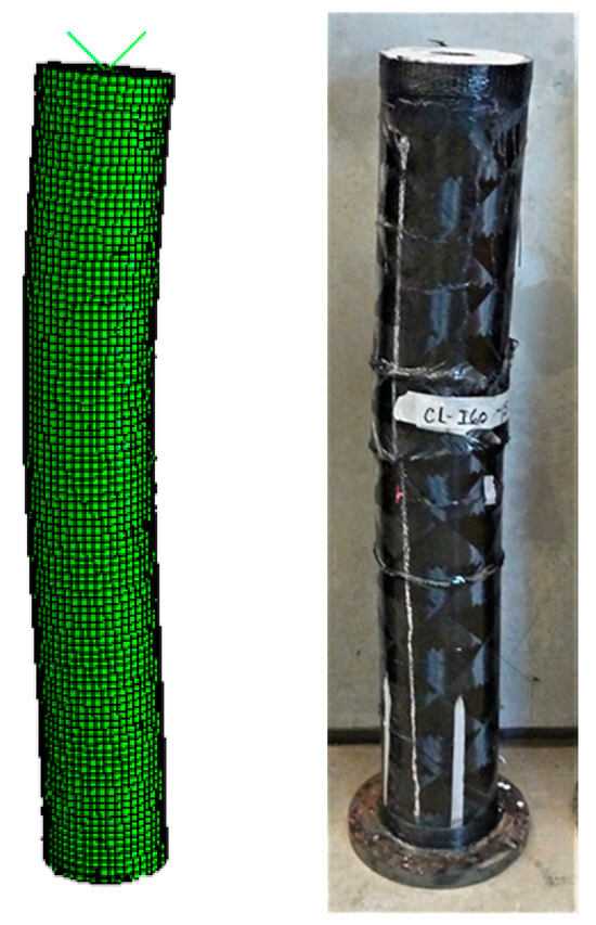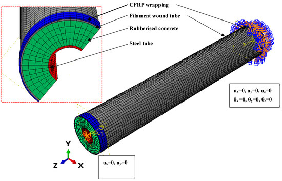 The three different components of the numerical model, namely, circular hollow steel (CHS) tube, composite laminates for filament wound CFRP, and rubberised concrete were developed as shown in Figure 2. The appropriate selection of the elements for the different parts is an important aspect of FE analysis, as the accuracy of the result depends on it. Based on the literature on previous FE analyses [25,26], S4R shell elements with hourglass control and reduced integration were used for steel, conventional shell elements S4R were used for the filament-wound CFRP tube, and eight-node linear solid elements C3D8R with reduced integration and hourglass control were chosen to model the rubberised concrete. Quadratic quadrilateral elements S8R were used to model the CFRP layer used in the experiment at the top and bottom ends of the column to prevent premature failure of the CFRP tube at the ends.