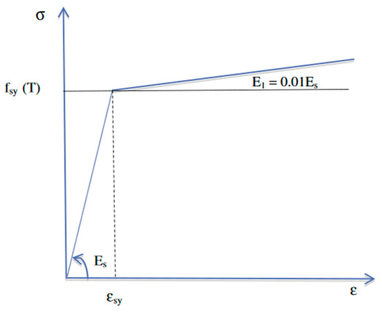 For steel tubes, the bilinear stress–strain model of steel as shown in Figure 3 suggested by Han et al. [36] was used as the material model as it was also used by Pagoulatou et al. [37] and Khusru et al. [11] for the simulation of double-skin columns.