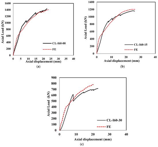 Based on the numerical approach discussed in this paper, the axial load–axial displacement characteristics of the tested specimens and those obtained from the validated FE models CL-I60-00, CL-I60-15, and CL-I60-30, respectively, are presented in Figure 4. Bilinear shapes of load-displacement plots are observed in both the tests and FE results. It is evident that the two sets of load–displacement curves, peak axial loads, and maximum displacements compare very well. With the increase in rubber content from Figure 4a–c, the load displacement curve shows a flattened peak, indicating gradual failure of the columns.