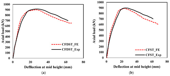 The experimental and FE results of (a) CFDST and (b) CFST columns.