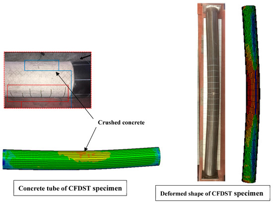 Buckling analysis using the linear perturbation command followed by the static RIKS was used as the analysis technique for modelling this eccentrically loaded column with the displacement control approach. Experimental and FE results of CFDST and CFST columns are presented in Figure 6a,b, respectively. Failure modes of the test and FE simulation are also compared in Figure 7. Good agreement was found, which ensures the reliability of the eccentric loading modelling technique.