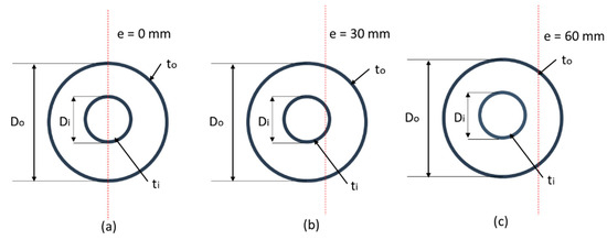 Figure 8 indicates the different eccentric load setups on the hybrid column. Here, Di indicates the inner diameter of the steel tube, Do is the outer diameter of the outer tube, and e indicates the eccentricity of the loading from the centre of the column.