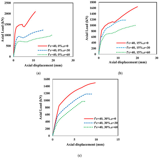 Axial load–axial displacement data from the FE analyses of the hybrid RuDSTC column are plotted in Figure 9 to ascertain the effect of load eccentricity with varying rubber content. The group of columns with unconfined concrete strength f′c = 40 MPa was selected to compare the effect of 0%, 15%, and 30% rubber for the load eccentricities of 0, 30, and 60 mm. Present results of FE analyses agree with previous test results regarding the reduction in axial capacity of the double-skin column [40] with increasing rubber content and eccentricity. For the non-rubberised column, a large load drop was observed, but with the increase in rubber content, the load drops were smaller and seemed to be somewhat mitigated. For 0% and 15% hybrid RuDSTC, a more pronounced increase in axial displacement was observed with the increase in load eccentricity, compared to that in the 30% hybrid counterpart.